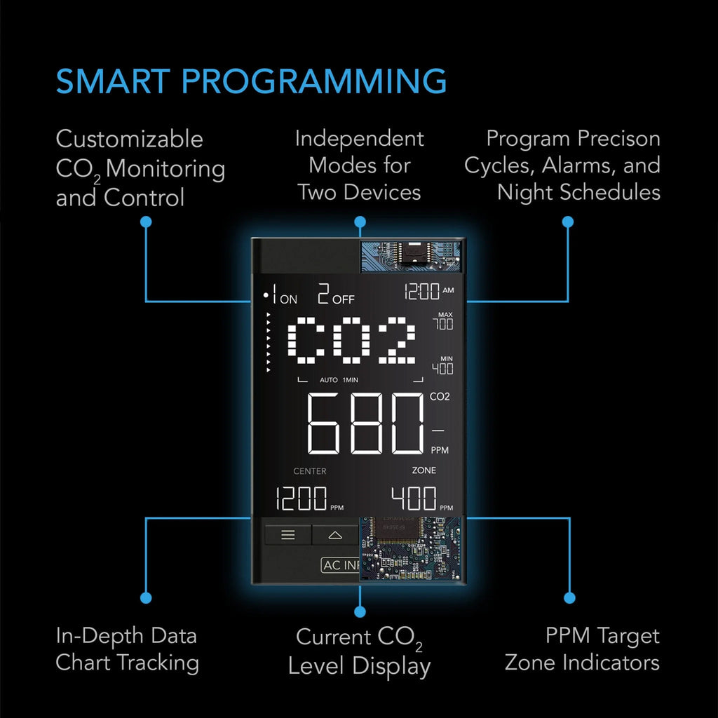 This smart CO2 controller includes two outlets to power and independently program CO2 regulators and exhaust fans. Able to support up to 1100W. Fit for use to monitor and adjust carbon dioxide levels in home and grow settings like greenhouses, grow rooms, grow tents, workrooms, labs, and more.