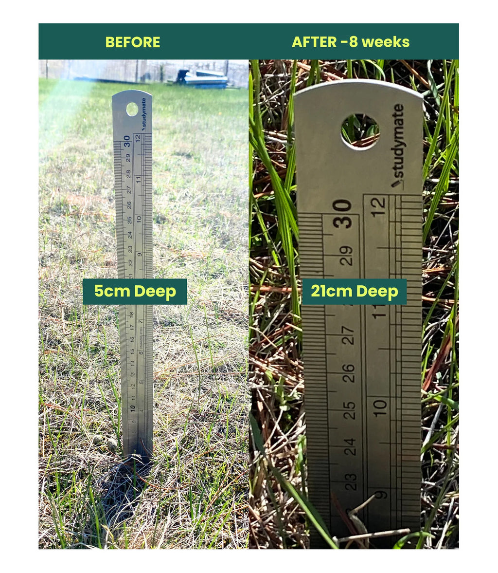 Field cores showed rapid infiltration improvements and visible restructuring within 12 weeks. Treated rows exhibited deeper root activity, stronger shoot vigour, and sustained soil moisture compared with untreated control areas.