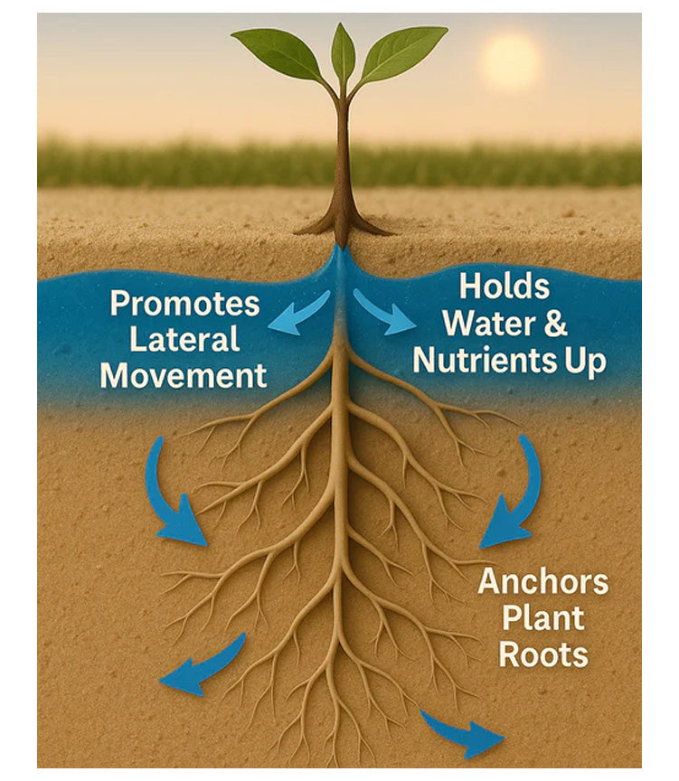 On coarse sands too large to truly bind, this film grips each particle, slowing the downward rush of water and holding it within the root zone. At the same time, the cationic sites attract and flocculate fine clays and dispersive materials, pulling them out of suspension and locking them into the sand matrix.