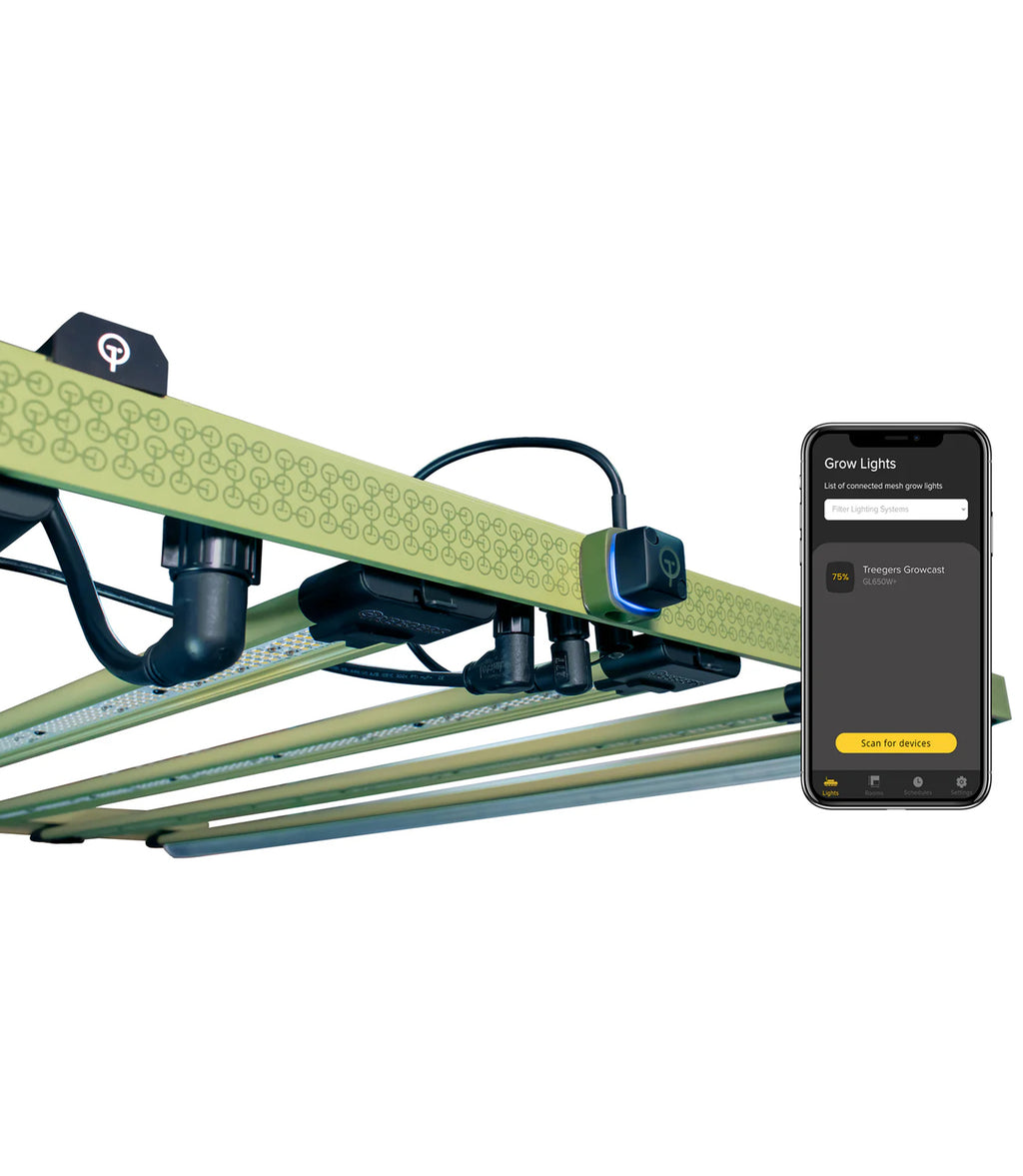 Control 1-1000 lights on a secure wireless protocol. Daisy chain up to 50 lights to a single Treegers Growcast. Monitors power usage and efficiency and adjusts the light brightness based on quantitative data.